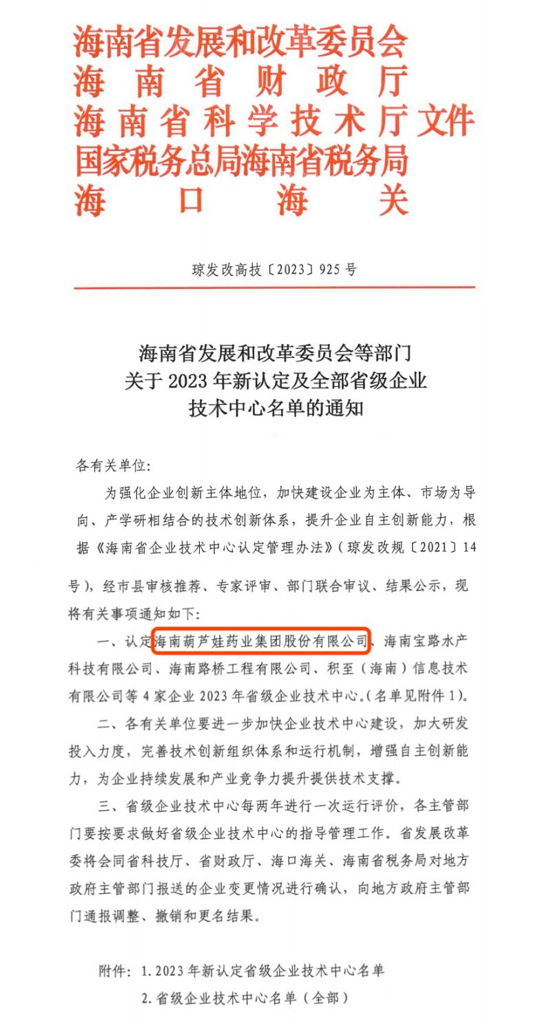 近日,海南省发改委等多部门联合公布了《关于2023年新认定及全部省级企业技术中心名单的通知》,其中,海南尊龙官方网站药业集团股份有限公司成功通过评审,被认定为省级企业技术中心,是本次获批的4家企业之一。